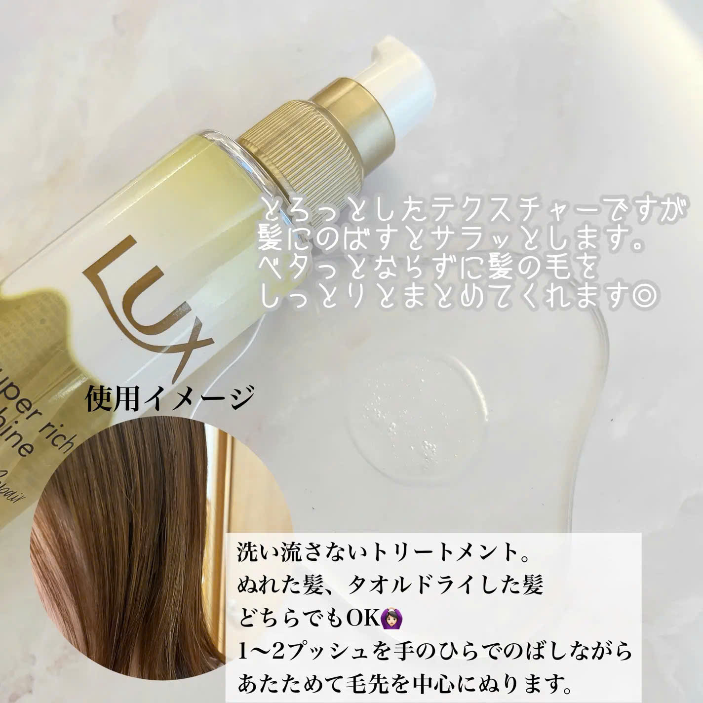 ✅ Sau khi gội đầu và lau khô tóc bằng khăn, lấy một lượng dầu dưỡng vừa đủ ra lòng bàn tay.