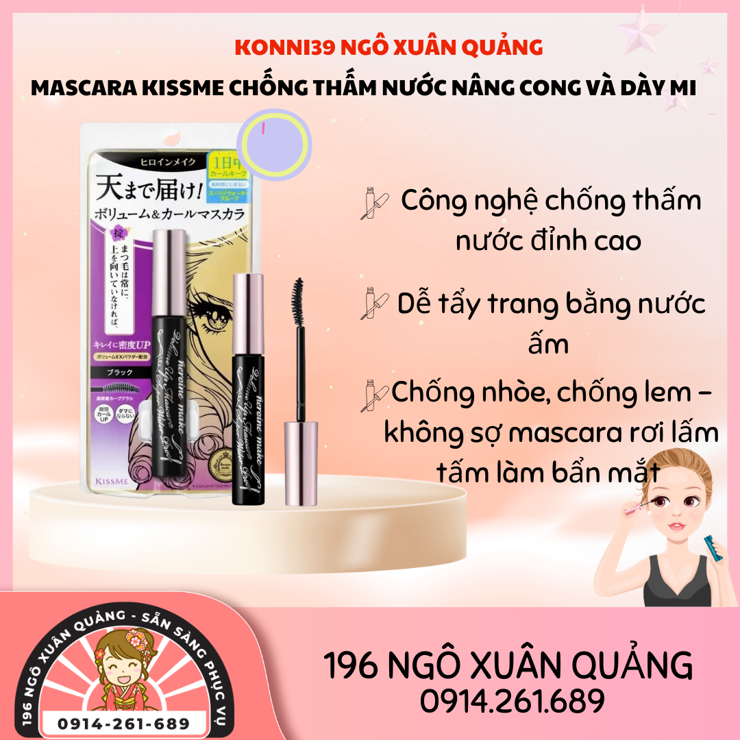 🔹 Mascara KissMe Heroine Waterproof – Công thức chống nước mạnh mẽ, bám lâu suốt ngày dài.