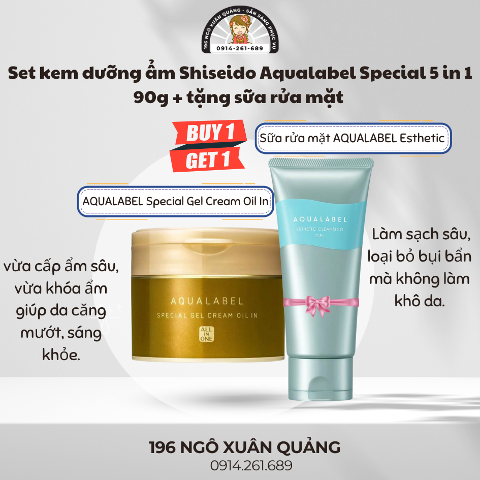 Shiseido Aqualabel Special Gel Cream Oil In tặng sữa rửa mặt AQUALABEL Esthetic Cleansing Gel, mang đến trải nghiệm chăm sóc da toàn diện với 5 công dụng trong 1: nước hoa hồng, sữa dưỡng da, tinh chất dưỡng ẩm, kem dưỡng và mặt nạ ngủ. Chỉ cần thoa một lớp mỏng trước khi ngủ hoặc khi da bạn trở nên khô để cảm nhận sự khác biệt.